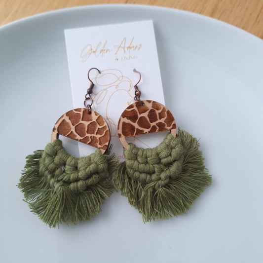Wood Print & Olive Green Macrame Earrings- Vacation Inspired